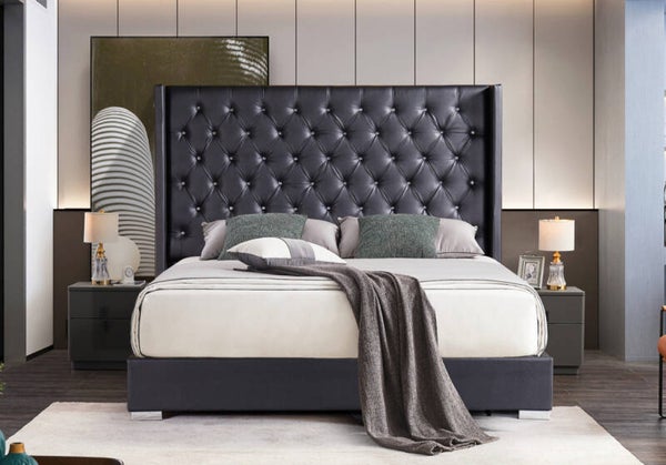 Bed frame with leather upholstery. Padded headboard offers additional comfort.